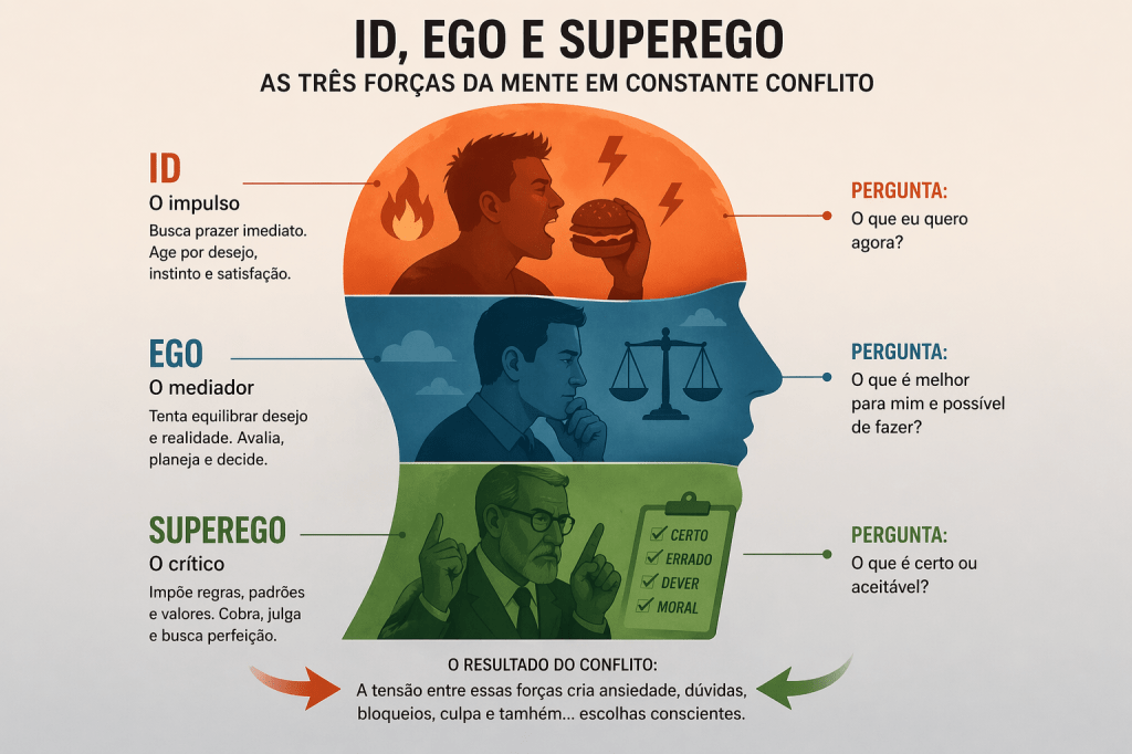 Freud organizou parte dessa dinâmica no famoso modelo do Id, do Ego e do Superego. Embora esse modelo não seja usado hoje como explicação científica do cérebro, ele continua sendo uma metáfora poderosa para entender conflitos internos. O Id representa os impulsos mais imediatos, orientados pelo princípio do prazer. O Ego tenta mediar esses impulsos com a realidade concreta. E o Superego funciona como instância crítica, moral e normativa, impondo cobranças, limites e, muitas vezes, culpa.