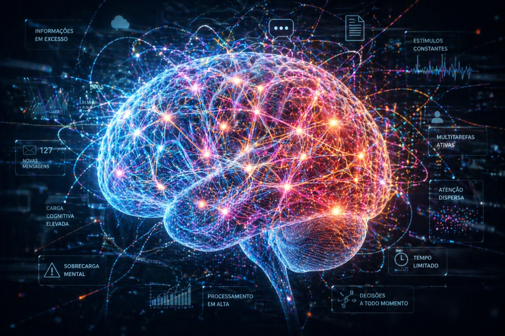 O que se observa hoje, no entanto, é um cenário completamente diferente. O cérebro moderno é exposto a uma sequência praticamente ininterrupta de estímulos, decisões, informações e demandas emocionais. Esse acúmulo cria o que a neurociência cognitiva descreve como sobrecarga cognitiva, um estado no qual a quantidade de informação e exigência supera a capacidade ideal de processamento do sistema nervoso. Diferente do cansaço físico, que costuma ser mais facilmente identificado, a sobrecarga cognitiva se manifesta de forma mais difusa, muitas vezes sendo percebida apenas como irritação, dificuldade de concentração ou sensação de esgotamento sem causa aparente.
