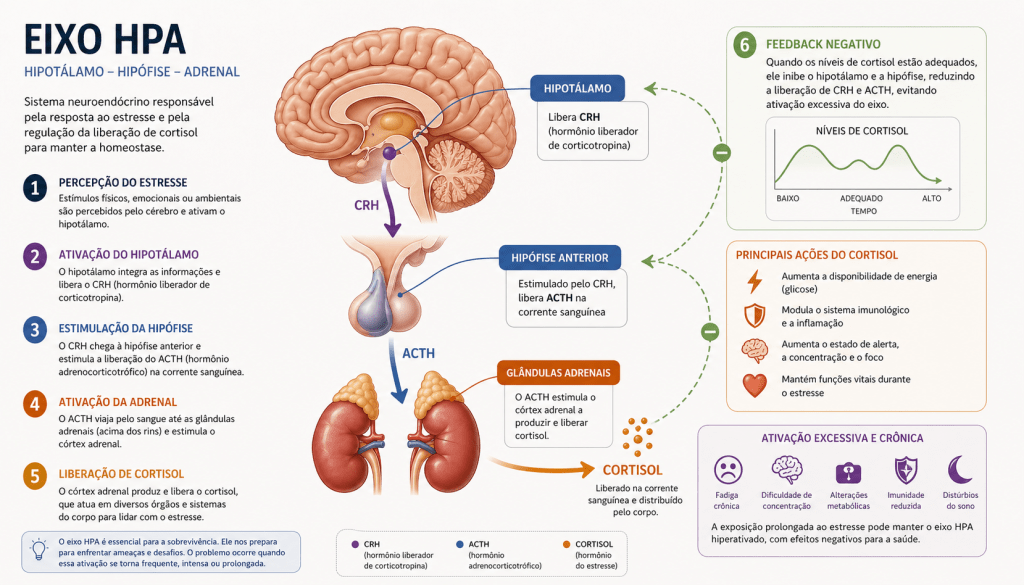 Outro componente fundamental desse processo é o eixo hipotálamo-hipófise-adrenal, conhecido como eixo HPA. Esse sistema regula a resposta ao estresse por meio da liberação de hormônios como o cortisol. Em situações agudas, esse mecanismo é extremamente adaptativo, permitindo que o organismo mobilize energia e responda a desafios. No entanto, quando ativado de forma contínua, ele deixa de ser funcional e passa a contribuir para um estado de desgaste.